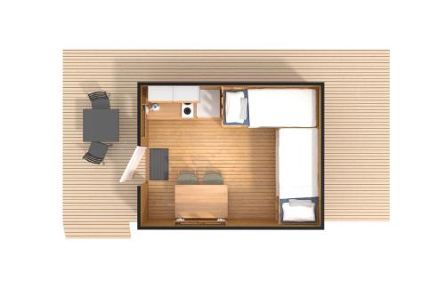 Denna villavagn har en matplats, parkettgolv, värme samt delat badrum. I det välutrustade pentryt finns spishäll, kylskåp och köksgeråd. Villavagnen med egen ingång har en te- och kaffekokare, en sittgrupp och en terrass med sjöutsikt. Här finns 4 sängar.